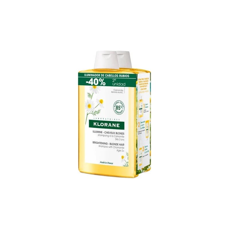 Klorane champú a la camomila reflejos dorados 400 ml, está indicado para potenciar el efecto rubio en el el cabello. Se puede utilizar como de uso frecuente al haberse introducido en una base emulsionante muy suave.